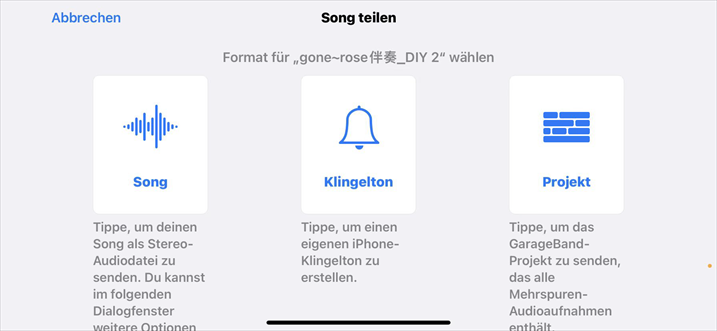 Tippen Sie auf das Pfeil-nach-unten-Symbol in der oberen linken Ecke > Wählen Sie „Meine Songs“ > Drücken Sie lange auf den Klingelton > Tippen Sie auf „Teilen“ > Option „Klingelton“wählen.