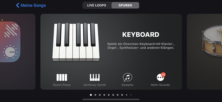Tippen Sie auf GarageBand, um die App zu starten > Tippen Sie auf die Option „SPUREN“ > Wählen Sie „KEYBOARD“.