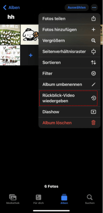 Schritt 5. Tippen Sie nach dem Erstellen des Albums auf das Symbol mit den drei Punkten und klicken auf Rückblicke-Video wiedergeben, um eine Erinnerung mit den Fotos oder Videos zu erstellen.