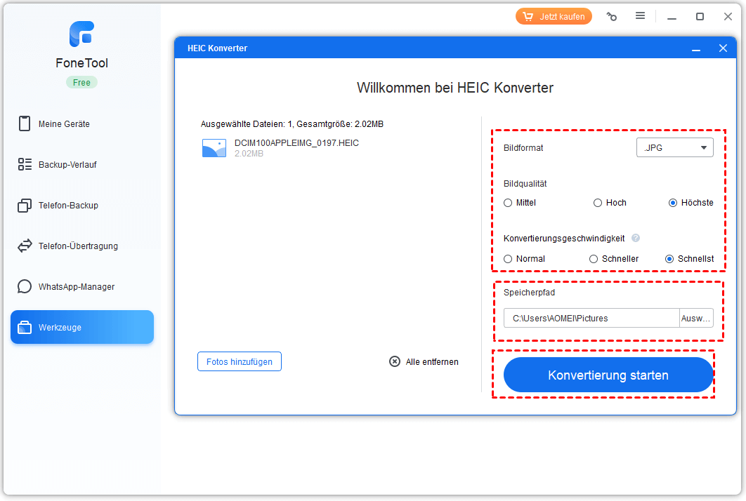 FoneTool ist ein professionelles iOS-Datenverwaltungstool für Windows 11/10/8/7-Benutzer. Dieses Tool unterstützt die Sicherung und Übertragung von Daten. Darüber hinaus bietet es auch viele nützliche Tools wie HEIC Konverter, die Ihnen helfen können, HEIC in JPG/JPEG/PNG zu konvertieren.