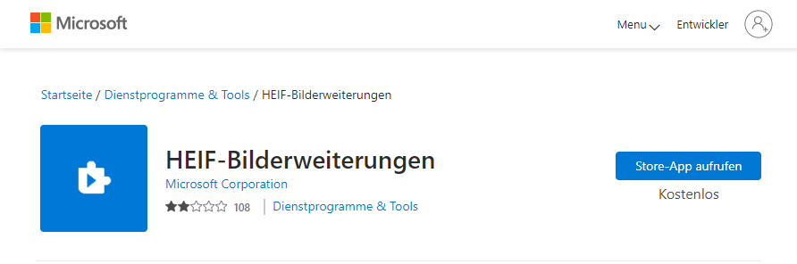 - Laden Sie HEIF-Bilderweiterungen auf Ihren Computer herunter, das im Microsoft Store erhältlich ist. Es ist ein kostenloses Tool und vielleicht ist es bereits auf Ihrem Computer installiert.
