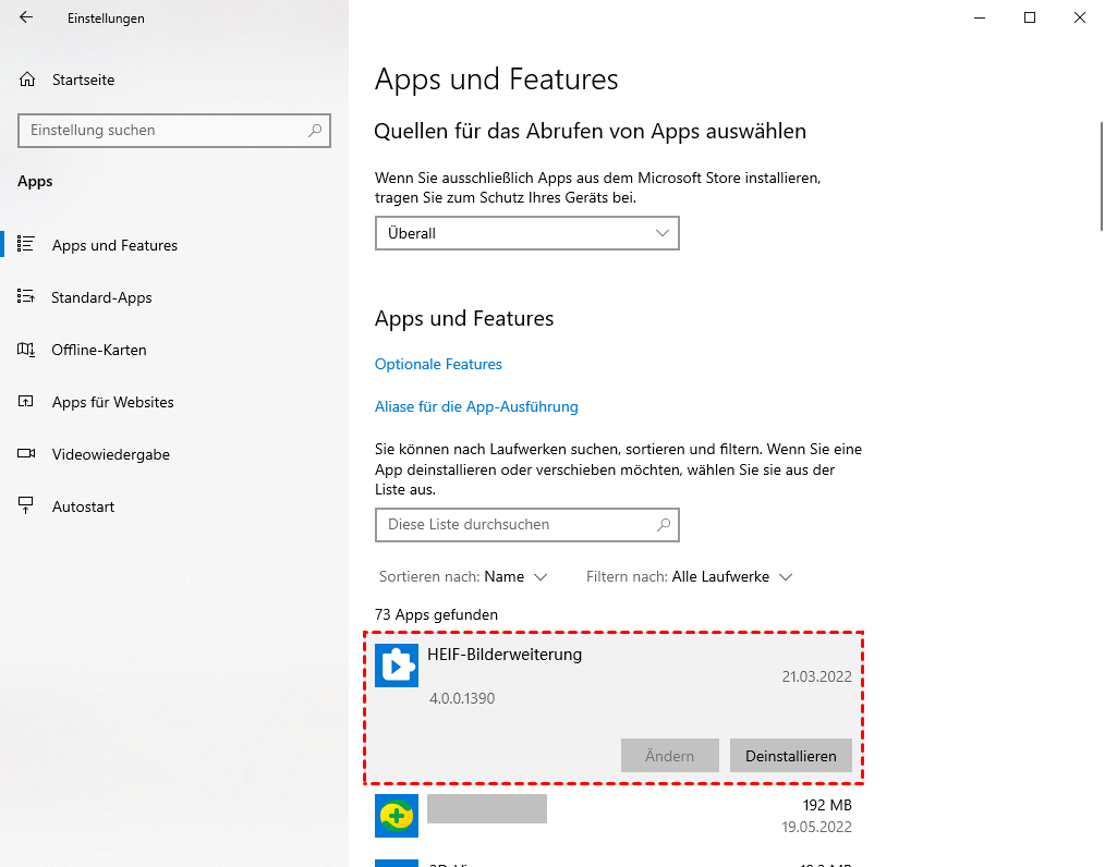 - Gehen Sie zu „Einstellungen“ > „Apps und Features“ auswählen.