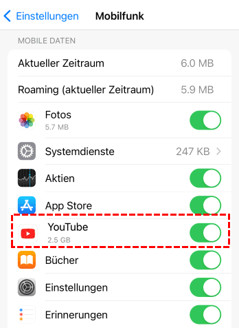 Schritt 2. Gehen Sie zu „Einstellungen“ > „Mobilfunk“ > „YouTube“. Schieben Sie die Schaltfläche auf grün, um sie zu aktivieren.