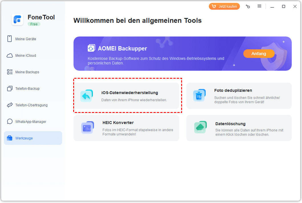 Schritt 2. Klicken Sie unter Werkzeuge auf iOS-Datenwiederherstellung, um den Scanvorgang Ihrer iPhone-Daten zu starten.