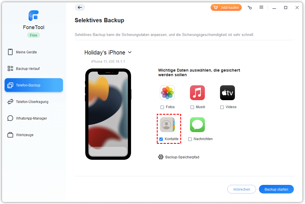 Schritt 1. Öffnen Sie FoneTool und klicken Sie auf: Telefon-Backup > Selektives Backup > Backup starten.
