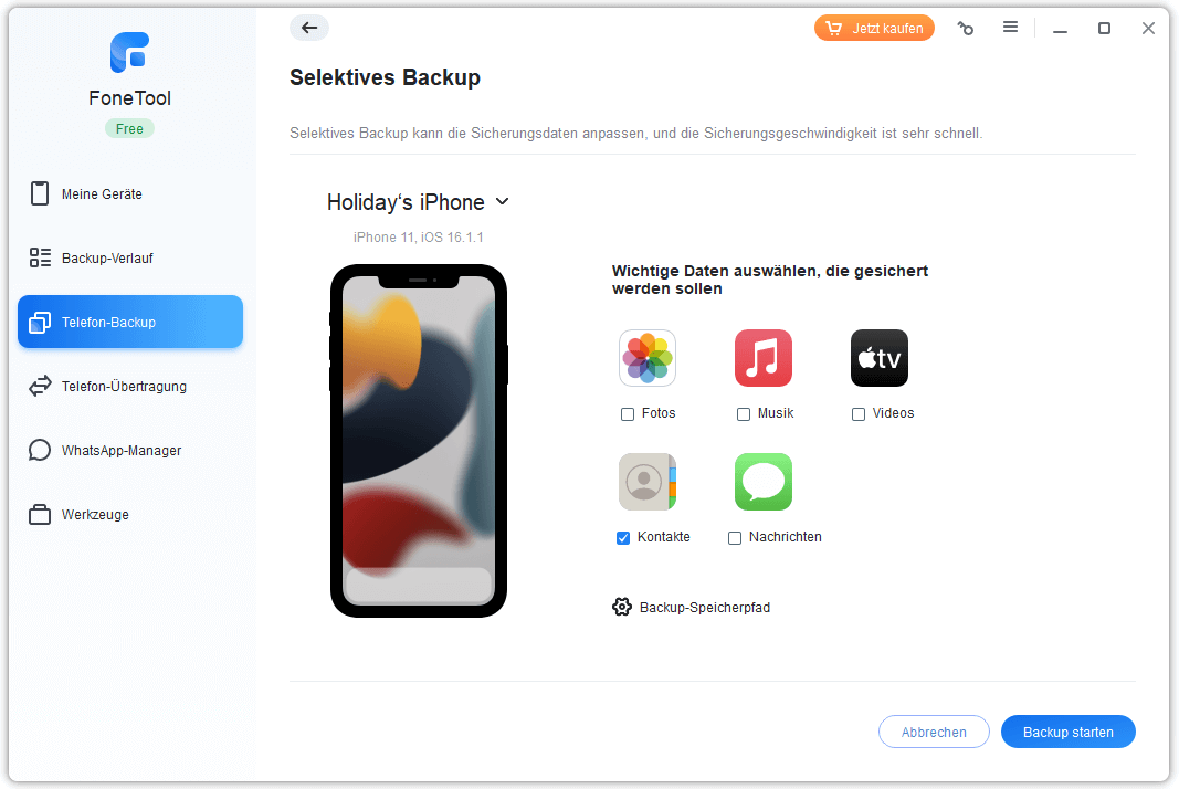 Wenn Sie iCloud oder iTunes zum Backup und Wiederherstellen von Daten verwenden, besteht eine extrem hohe Wahrscheinlichkeit eines Datenverlusts. Daher empfehle ich hier eine bessere iOS-Sicherungssoftware namens FoneTool, die Ihr iOS-Gerät sicherer sichern kann, um Datenverlust zu vermeiden.