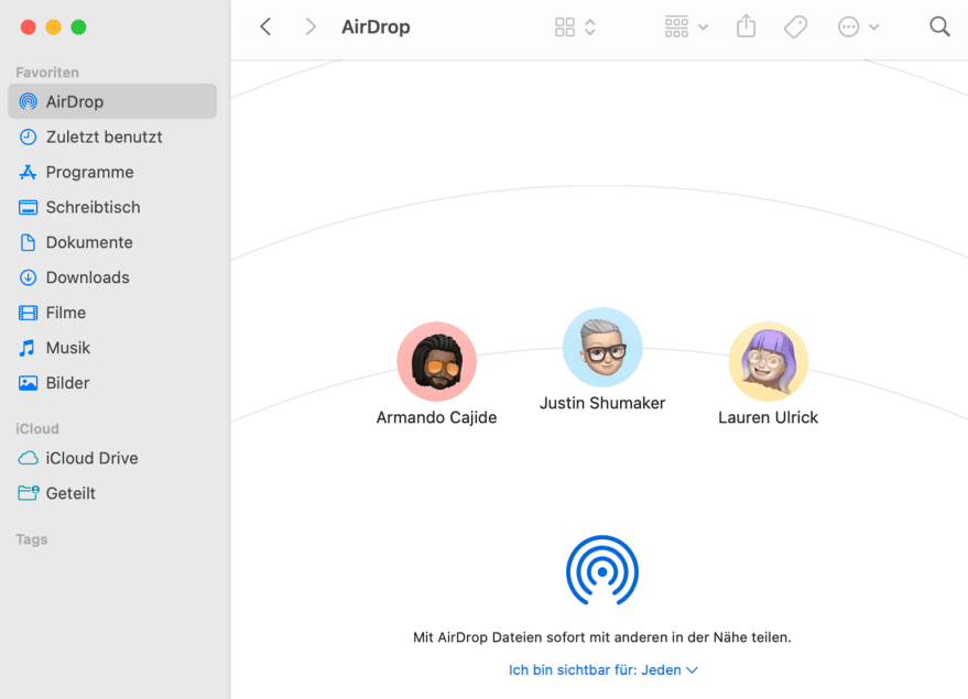 Schritt 1. Führen Sie den Finder auf dem Mac aus, gehen Sie zu AirDrop oder drücken Sie Befehl-Umschalt-R. In einem Fenster werden die verfügbaren Geräte angezeigt.