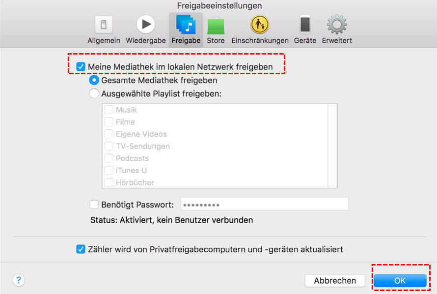3. Sie können wählen, ob Sie die gesamte Bibliothek freigeben möchten. Dann werden alle darin enthaltenen Daten freigegeben. Sie können ausgewählte Wiedergabelisten freigeben und die Option „Podcasts“ aktivieren. Klicken Sie dann auf OK.