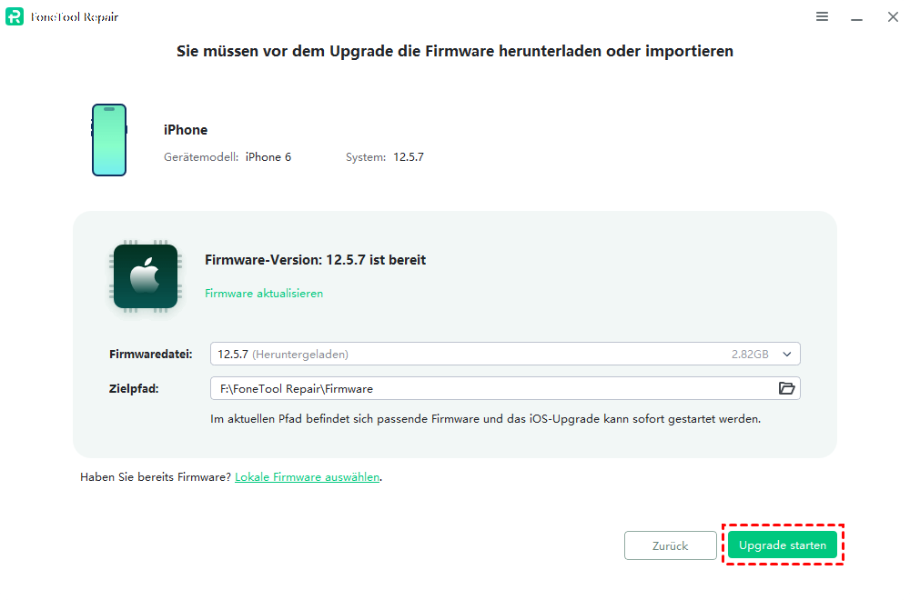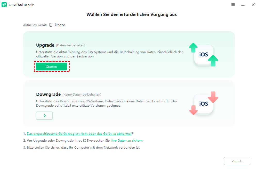 Schritt 3. Wir nehmen das iPhone als Beispiel auf, tippen Sie auf das Upgrade und tippen Sie auf Starten.