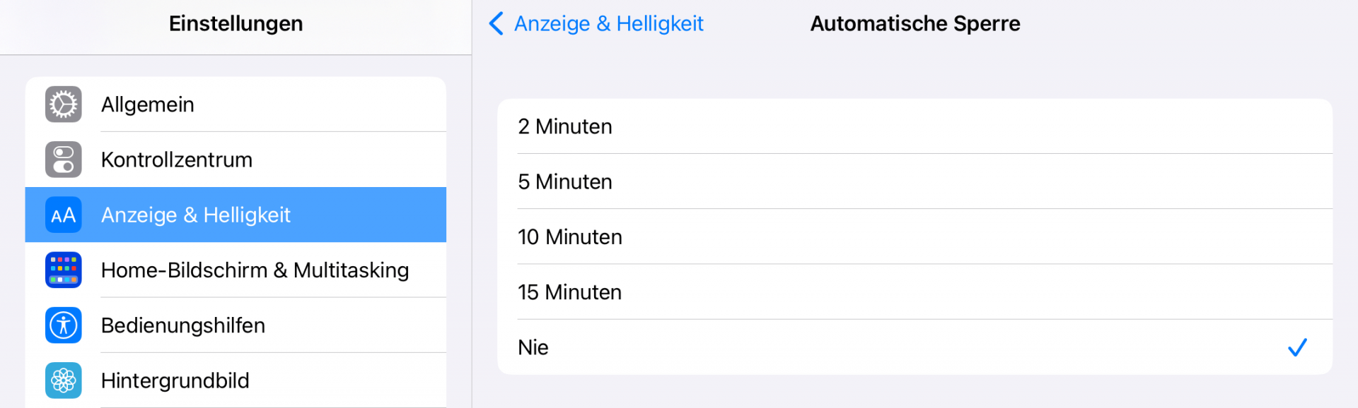 Überprüfen Sie die automatische Sperrfunktion auf Ihrem iPad und stellen Sie sicher, dass sie aktiviert ist. Oftmals deaktivieren Benutzer die automatische Sperrfunktion versehentlich, sodass sich der Bildschirm auch nach einer Stunde Inaktivität nicht ausschaltet.