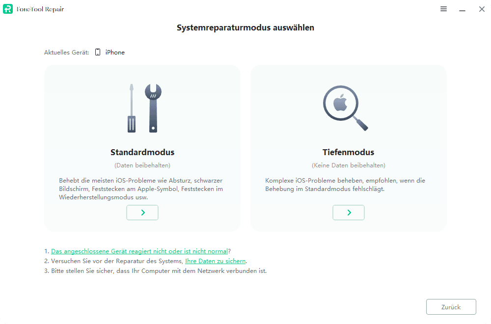 Schritt 2: Wählen Sie im Pop-up-Fenster „Systemreparaturmodus auswählen“ je nach Situation den Standardmodus (ohne Datenverlust) oder den Tiefenmodus (alle Daten löschen).