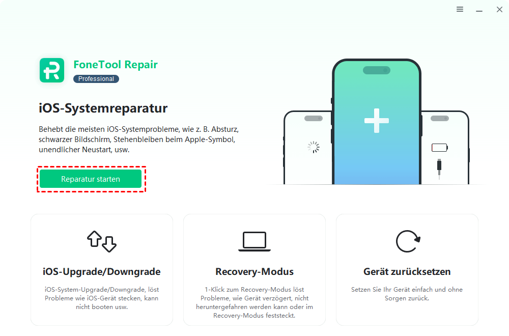 Wenn iOS-Softwarefehler tief im System verankert sind und herkömmliche Methoden nicht helfen, benötigen Sie ein spezialisiertes Reparaturtool. Mit FoneTool Repair können Sie zahlreiche iOS-Systemprobleme effektiv beheben – darunter schwarzer Bildschirm, eingefrorene Oberfläche, nicht reagierende Apps oder Boot-Loops.