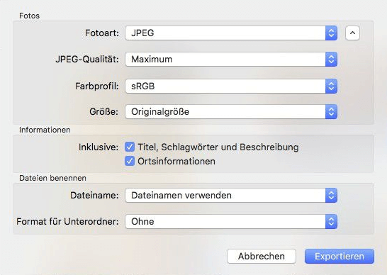 Wie erstelle ich auf dem Mac ein Bild über „Fotos“ in ein JPEG-Format?