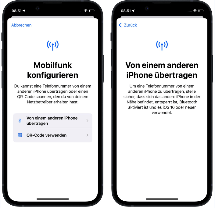 Wenn auf Ihrem alten iPhone iOS 16 installiert ist, können Sie über Bluetooth den Mobilfunktarif auf das neue iPhone übertragen. Allerdings unterstützen nicht alle Netzbetreiber diese Funktion.
