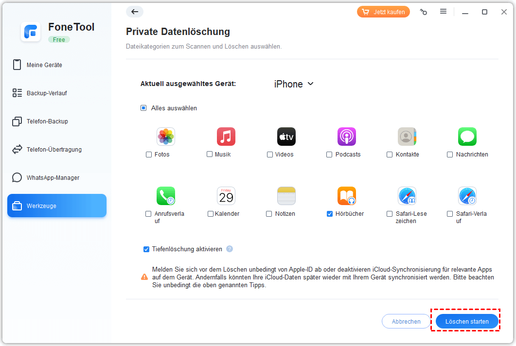 Wenn Sie eine dauerhafte Lösung zum Löschen von Hörbüchern vom iPhone benötigen, können Sie FoneTool verwenden. Diese Software bietet eine zuverlässige Methode zum dauerhaften Löschen von Hörbüchern.