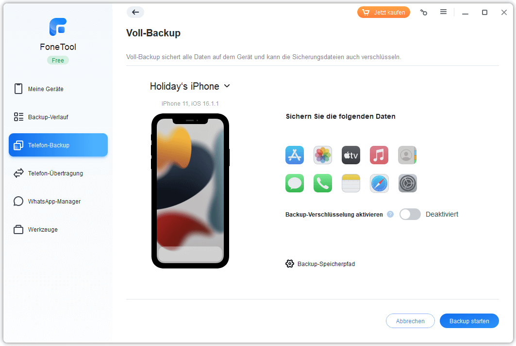 Sobald Sie Ihre fehlenden iBooks erfolgreich wiederhergestellt haben, ist es eine gute Idee, die Daten Ihres iOS-Geräts vollständig zu sichern, um einen plötzlichen Datenverlust in der Zukunft zu verhindern. Die Verwendung von FoneTool für kostenlose iPhone/iPad-Backups ist die ideale Wahl.