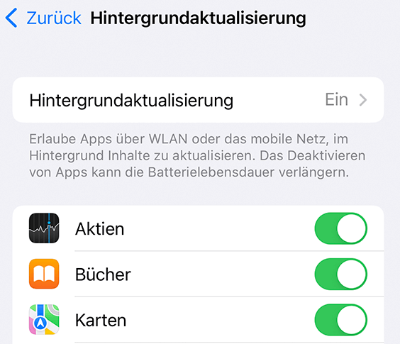 Wenn Sie unerwartet feststellen, dass Bücher aus iBooks verschwunden sind, können Sie „Einstellungen“ auf Ihrem iPhone oder iPad öffnen > Gehen Sie zu Hintergrundaktualisierung > Deaktivieren Sie dann die Option „Bücher“ und aktivieren Sie sie erneut.