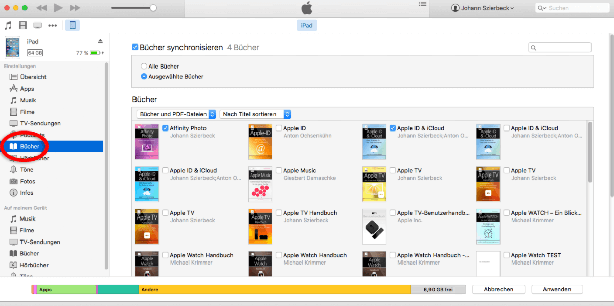 Verbinden Sie Ihr iPhone mit Ihrem Computer > Starten Sie iTunes > Klicken Sie auf das iPhone- oder iPad-Symbol > Tippen Sie im Abschnitt „Einstellungen“ auf „Bücher“ > Wählen Sie die Zielbücher aus, die Sie wiederherstellen möchten > Wählen Sie die Optionen „Bücher und ausgewählte Bücher synchronisieren“ oder „Alle Bücher“ > Tippen Sie auf „Anwenden“.