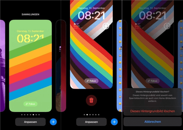 Entsperren Sie Ihr Gerät > Drücken Sie lange auf den Sperrbildschirm > Wischen Sie auf dem Hintergrundbild, das Sie löschen möchten, nach oben und tippen Sie dann auf die Schaltfläche „Papierkorb“, um es zu entfernen. Wiederholen Sie dies für alle vorhandenen Sperrbildschirm-Hintergrundbilder.