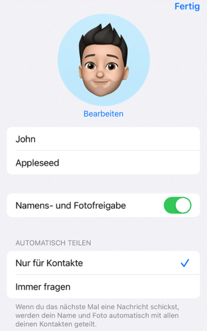 Schritt 2: Aktivieren Sie die Option „Namens- und Fotofreigabe“ und stellen Sie den Kontakt auf „Nur Kontakte“ ein.