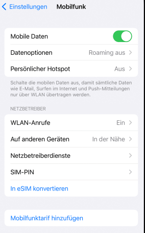 Für mobile Daten: Entsperren Sie Ihr iPhone mit einem Passcode oder Face ID und öffnen Sie die App „Einstellungen“ > Navigieren Sie zu „Mobilfunk“ (oder „Mobile Daten“, je nach Region) > Tippen Sie auf „Mobile Daten“ (oder „Mobile Datenoptionen“) > Schalten Sie den Schalter „Modus mit geringem Datenvolumen“ aus.