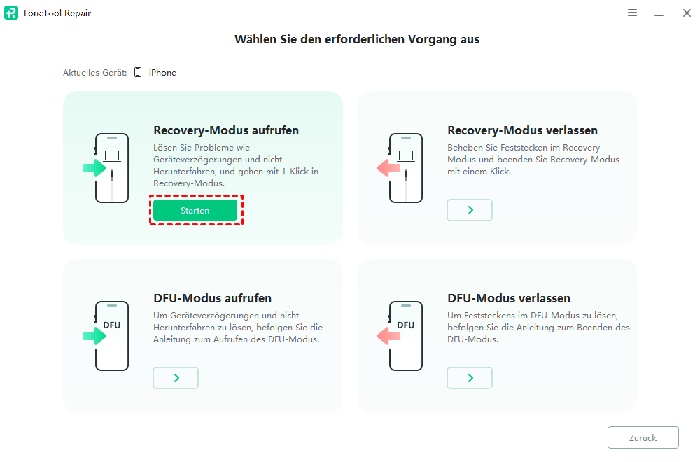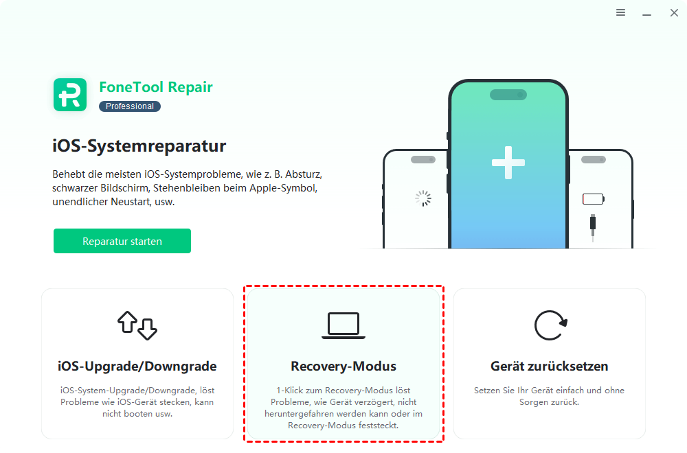 Schritt 1. Verbinden Sie Ihr iPad über USB mit dem Computer > Starten Sie FoneTool Repair > Klicken Sie auf Recovery-Modus.