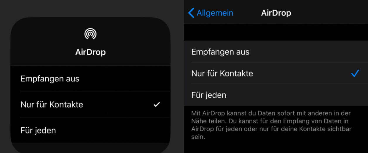☞ Für jeden. Wenn Sie sich nicht in ihren Kontakten befinden, muss das Ziel-iPhone die AirDrop-Empfangseinstellungen auf „Für jeden“ einstellen, um Dateien zu empfangen.