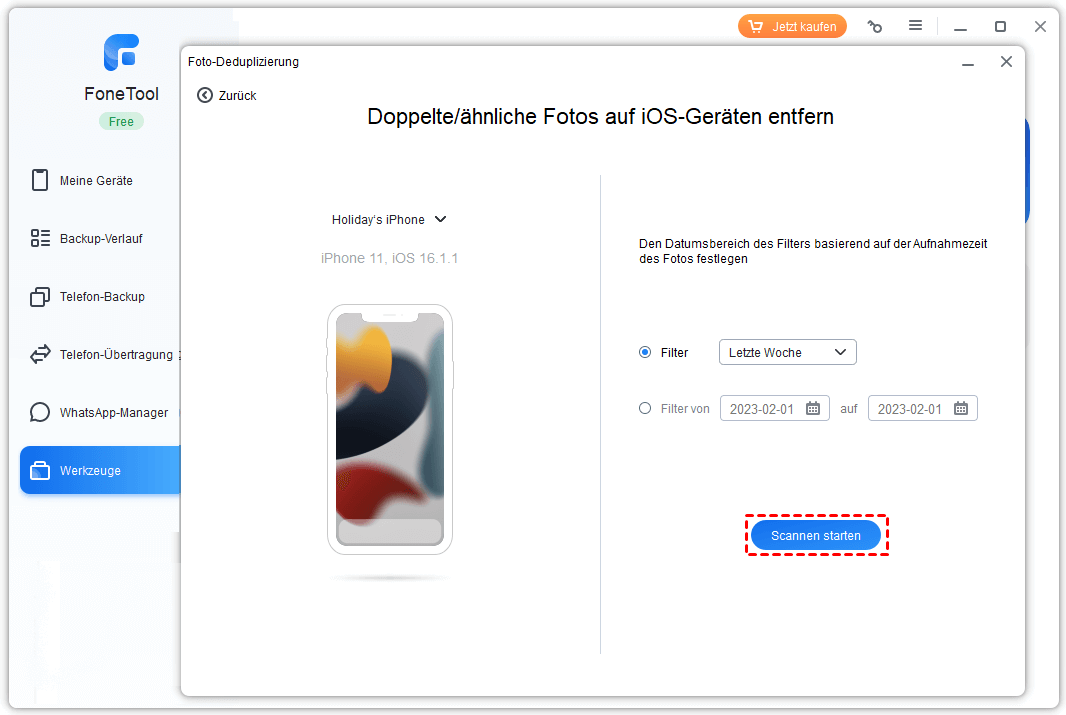 Mit der Foto-Deduplizierungsfunktion in FoneTool werden alle ähnlichen und doppelten Fotos auf Ihrem iPhone blitzschnell gescannt. Sie können einige davon löschen, um den begrenzten Speicherplatz auf Ihrem iPhone zu optimieren. Sie können sich auch darauf verlassen, dass Duplikate auf Ihrem Computer gelöscht werden.