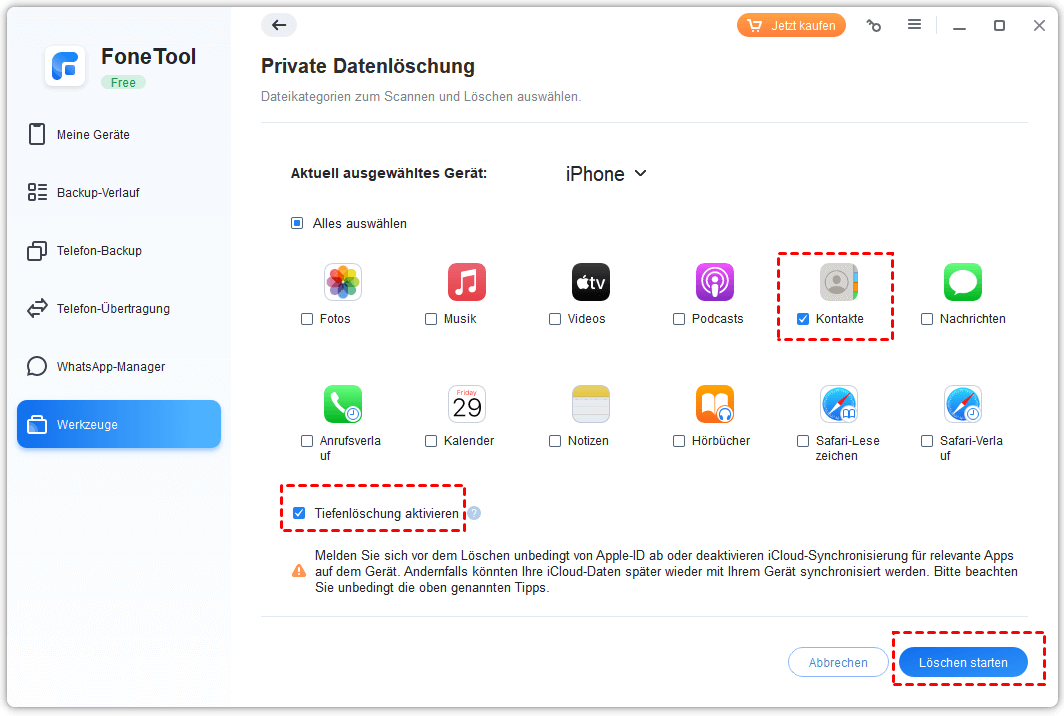 Schritt 2. Starten Sie FoneTool und klicken Sie auf Werkzeuge > Datenlöschung > Bewegen Sie den Mauszeiger auf „Private Datenlöschung“ und klicken Sie auf „Starten“.