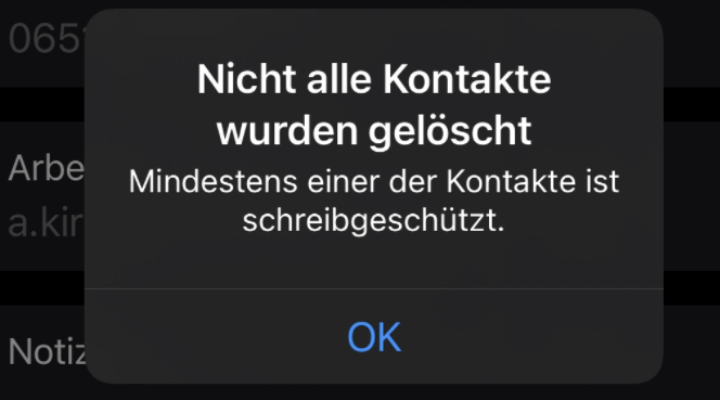 Wenn Sie also schreibgeschützte Kontakte auf dem iPhone löschen, erhalten Sie möglicherweise eine Fehlermeldung, die besagt, dass nicht alle Kontakte gelöscht wurden. Machen Sie sich keine Sorgen, als Nächstes erklären wir Ihnen, warum Ihre Kontakte schreibgeschützt sind und zeigen Ihnen, wie Sie auf dem iPhone schreibgeschützte Kontakte löschen können.