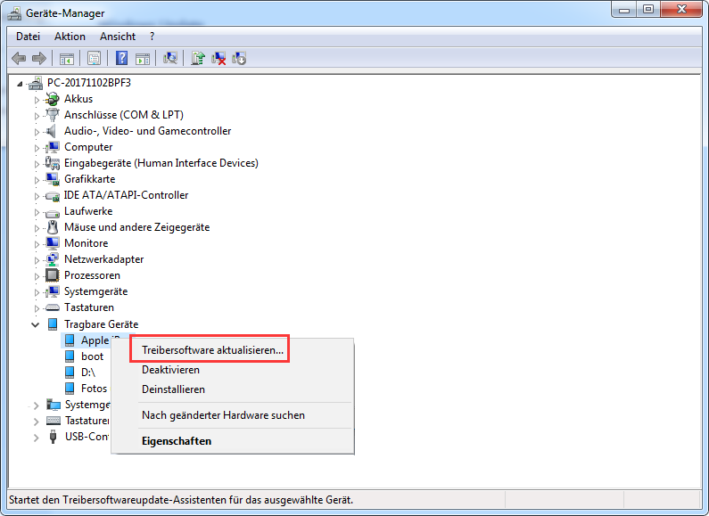 Wenn das Problem „iPhone verbindet sich nicht mit PC“ mit den oben genannten Tipps nicht behoben werden kann, liegt möglicherweise ein veralteter Treiber vor, der die Verbindung des iPhone mit dem PC verhindert.