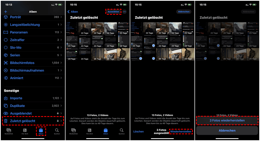 Dies kann mühelos sein, wenn Sie gelöschte Fotos aus dem Album „Zuletzt gelöscht“ wiederherstellen möchten. Tippen Sie im Fußzeilenmenü der Fotos-App auf „Alben“ > Suchen Sie das zuletzt gelöschte Album und tippen darauf > Wählen Sie die Fotos aus, die Sie wiederherstellen möchten, und tippen Sie auf „Wiederherstellen“.