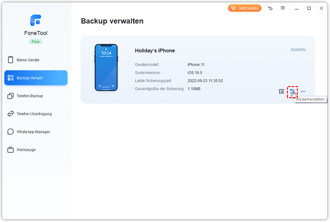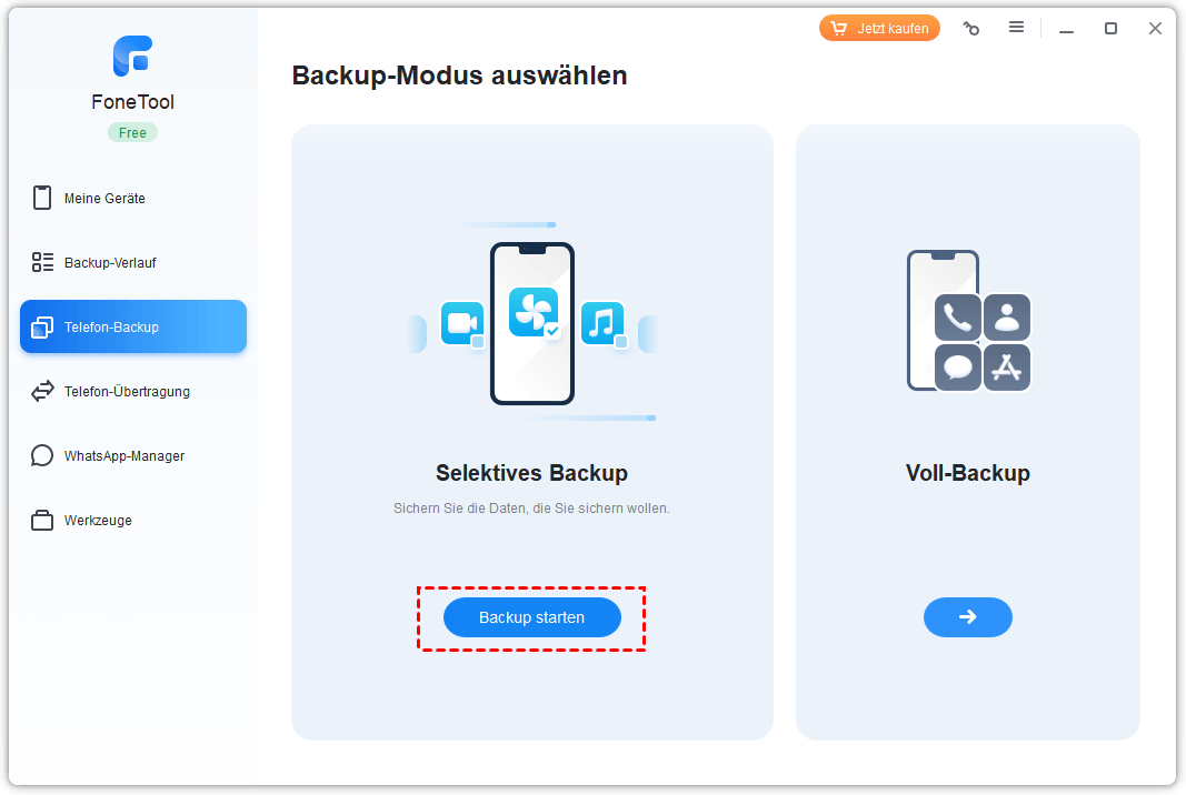 Schritt 2. Starten Sie FoneTool > Klicken Sie auf „Telefon-Backup“ > Suchen Sie „Selektives Backup“ und klicken auf „Backup starten“.