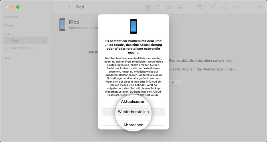 Schritt 3. Verbinden Sie Ihren iPod Touch mit dem Computer. iTunes erkennt automatisch, dass sich Ihr iPod Touch im Wiederherstellungsmodus befindet, und klicken Sie im Pop-up-Fenster auf „Wiederherstellen“.