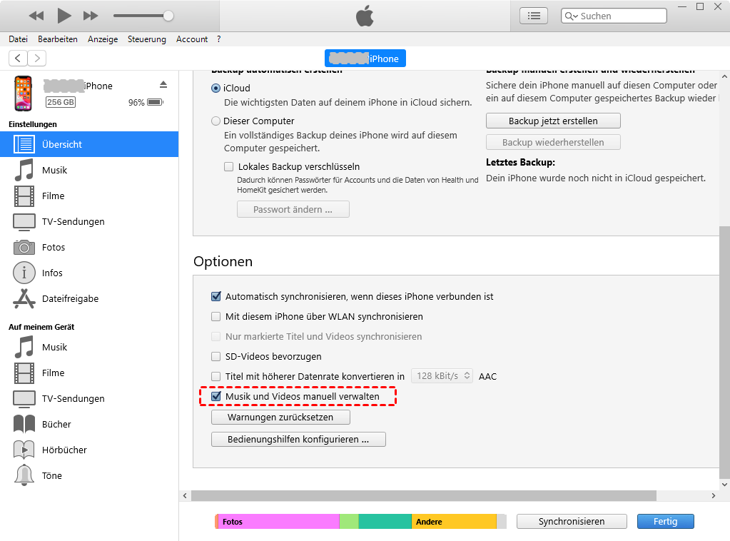 3. Aktivieren Sie in der Spalte „Optionen“ das Kontrollkästchen neben „Musik und Videos manuell verwalten“.
