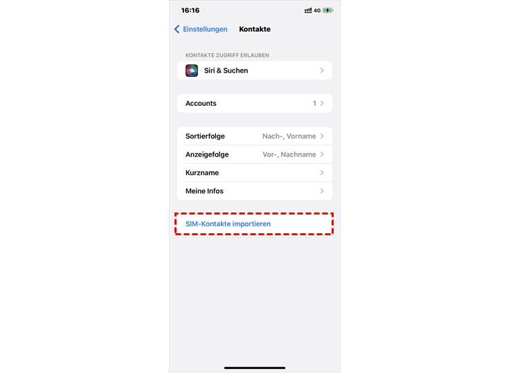 Wenn auf der SIM-Karte Kontakte gespeichert sind, können Sie zu: „Einstellungen“ > „Kontakte“ gehen und auf „SIM-Kontakte importieren“ tippen, um Kontakte auf das iPhone zu verschieben. Auf diese Weise gehen Ihre Kontakte nach einem SIM-Kartenwechsel nicht verloren.