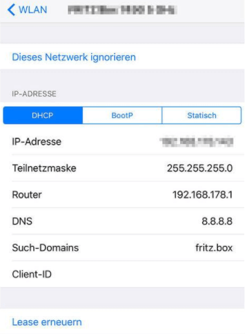 Öffnen Sie die Einstellungen-App auf Ihrem iPhone > Navigieren Sie zum Abschnitt „WLAN“ > Tippen Sie auf das kleine „i“-Symbol neben dem Namen Ihres WLAN-Netzwerks > Suchen Sie nach der DHCP-Option > Tippen Sie einfach auf „Lease erneuern“ und schon sind Sie fertig.