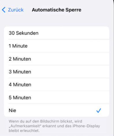 Klicken Sie auf Einstellungen > Tippen Sie auf „Anzeige & Helligkeit“ > Klicken Sie auf „Automatische Sperre“ > Wählen Sie „Nie“.