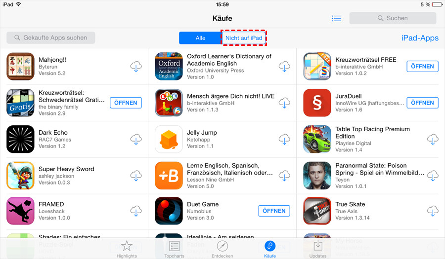 Schritt 3. Klicken Sie auf „Gekauft“ und dann auf „Nicht auf diesem iPad“.
