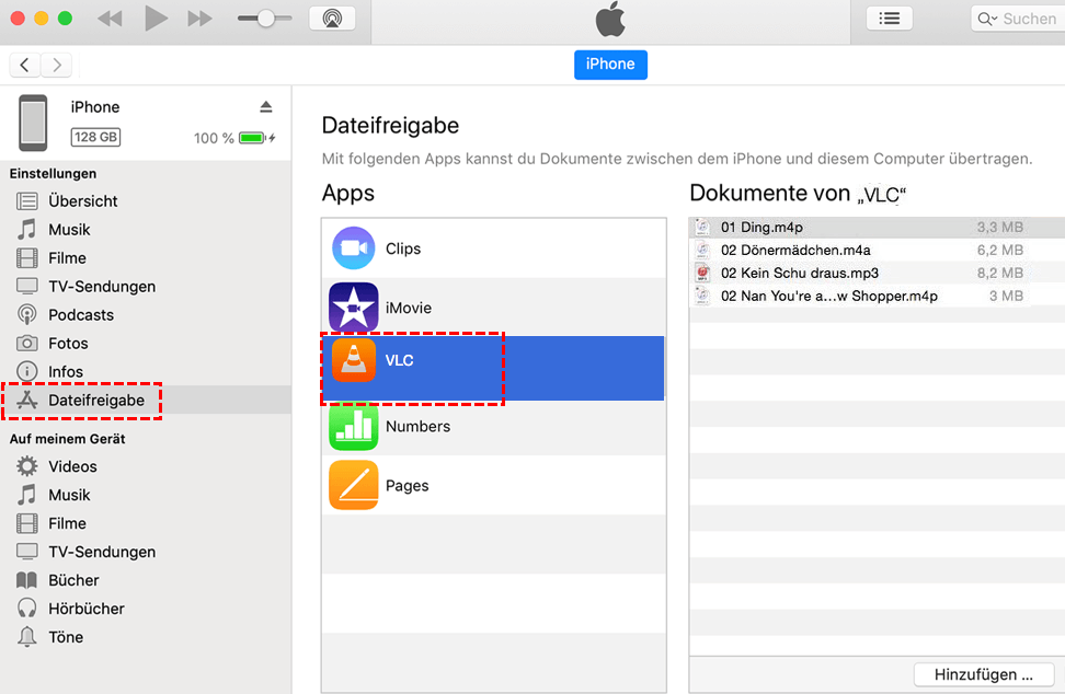 iTunes ist das offizielle Tool für iPhone-Benutzer zum Verwalten von Mediendateien. Es kann Ihnen helfen, Musik, Fotos und Videos vom PC zum iPhone hinzuzufügen. Die Rückübertragung wird jedoch nicht unterstützt. Mit iTunes können Sie nur Dateien übertragen, die mit Keynotes, Numbers, Pages, Kindle oder anderen Apps erstellt wurden, die mit File Sharing funktionieren.