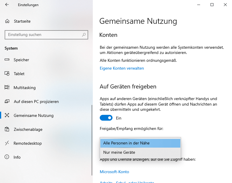 Gehen Sie auf Ihrem PC zu „Einstellungen“ > Klicken Sie auf „System“ > Wählen Sie „Gemeinsame Nutzung“ > Wählen Sie „Nur Meine Geräte“ aus.