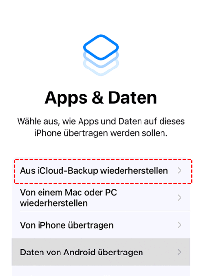 ☞ Richten Sie Ihr iPhone ein, bis Sie den Bildschirm Apps & Daten aufrufen. Wählen Sie Aus iCloud-Backup wiederherstellen.