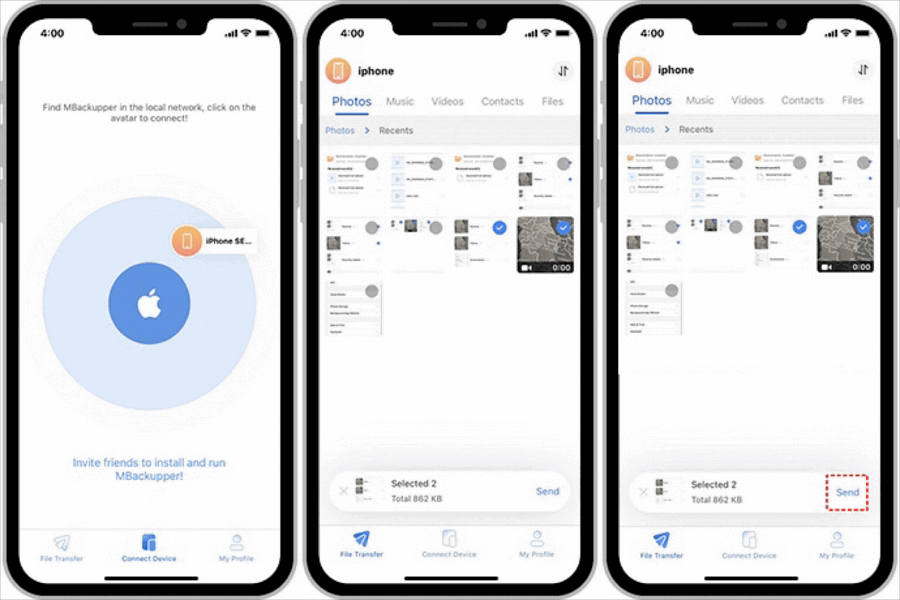 ☞ Wählen Sie auf dem Quell-iPhone Dateiübertragung> wählen Sie die benötigten Dateien aus > tippen Sie auf Übertragen. Danach können Sie die Übertragungsliste aufrufen, um den Fortschritt zu überprüfen.