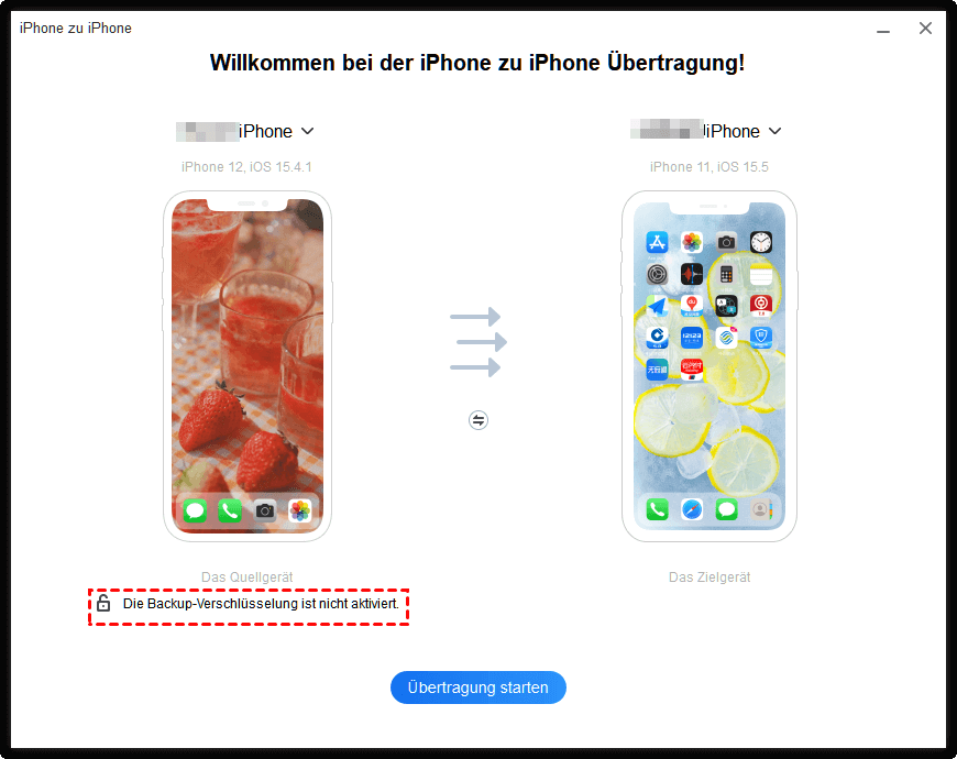 ☞ Bestätigen Sie das Quellgerät und das Zielgerät > Aktivieren Sie die Verschlüsselung der Sicherung > Klicken Sie auf Übertragung starten.