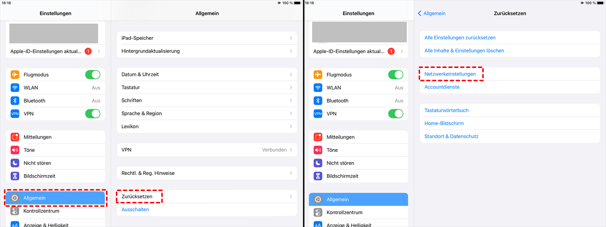 ▶ Um unbekannte Netzwerkprobleme zu vermeiden, die dazu führen, dass das iPad nicht auf das neue iPad übertragen werden kann, können Sie alle Netzwerkeinstellungen zurücksetzen. Gehen Sie zu Einstellungen > Allgemein > iPad übertragen/ zurücksetzen> Zurücksetzen > Wählen Sie Netzwerkeinstellungen > Tippen Sie zur Bestätigung auf Zurücksetzen.