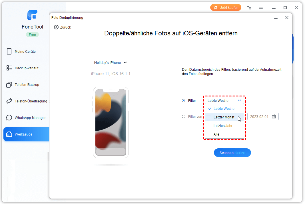 FoneTool ist auch ein iPhone-Übertragungstool. Es unterstützt das Löschen doppelter und ähnlicher Fotos sowie das Übertragen benötigter Fotos auf den Computer/externe Festplatte ohne Duplikate. Scannen Sie das iPhone, nachdem Sie „Foto deduplizieren“ ausgeführt haben. Es wird Ihnen helfen, alle doppelten Fotos herauszufinden und zu löschen.
