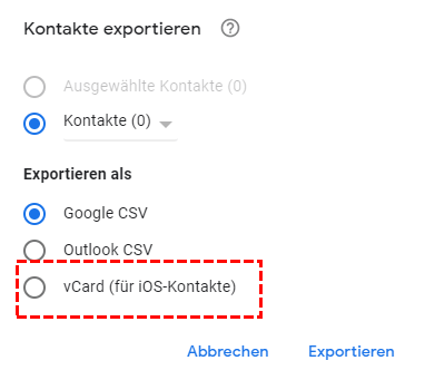 2. Stellen Sie sicher, dass Sie alle gewünschten Kontakte ausgewählt haben > Wählen Sie vCard (für iOS-Kontakte) > Klicken Sie auf Exportieren.
