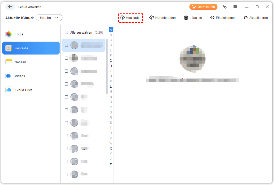 Schritt 2. Klicken Sie auf „iCloud verwalten“ und wählen Sie auf der nächsten Seite „Kontakte“. Tippen Sie auf das Symbol „Hochladen“, um auf die Gmail-Kontakte zuzugreifen, die Sie auf Ihrem Computer gespeichert haben.