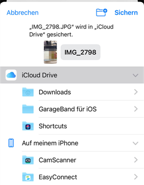 Wenn Sie zum Beispiel Fotos übertragen möchten, wählen Sie die gewünschten Fotos aus und tippen Sie auf die Schaltfläche Freigeben > wählen Sie dann In Dateien speichern > wählen Sie schließlich iCloud Drive als Ziel. Danach können Sie die Dateien-App auf einem anderen Gerät aufrufen, um die Fotos anzuzeigen.