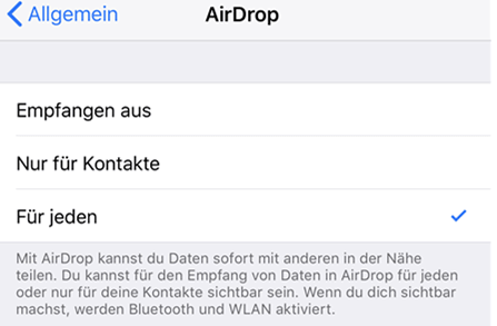 Schritt 1. Gehen Sie zu: Einstellungen > Allgemein > AirDrop. Wählen Sie „Für jeden“ oder „Nur für Kontakte“.